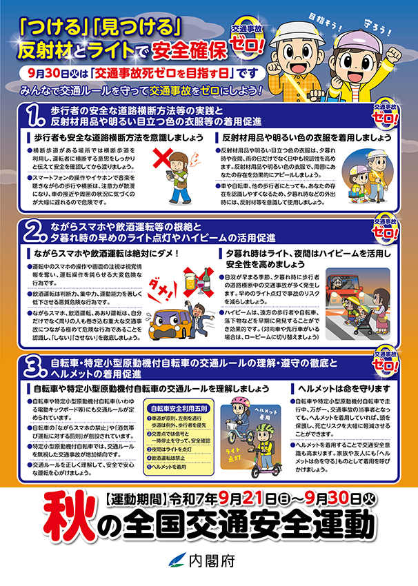今回の運動期間は、令和7年9月21日(日)から30日(火)までの10日間で、期間中のゼロの付く日である9月30日(火)を「交通事故死ゼロを目指す日」としています。